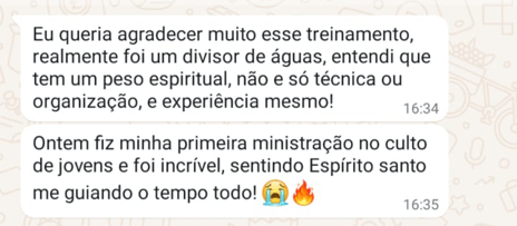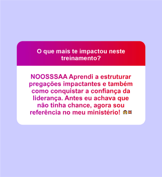 É um treinamento para quem quer avançar no ministério e dar um passo para o seu chamado, o treinamento "Do Líder de Célula a Líder de Ministério até ao Pastoral" é um plano estratégico completo para te preparar espiritualmente e estruturalmente para crescer na igreja. Você aprenderá como desenvolver autoridade, conquistar a confiança da liderança e avançar pelos 5 níveis ministeriais, chegando ao pastoreio e gestão de ministérios.